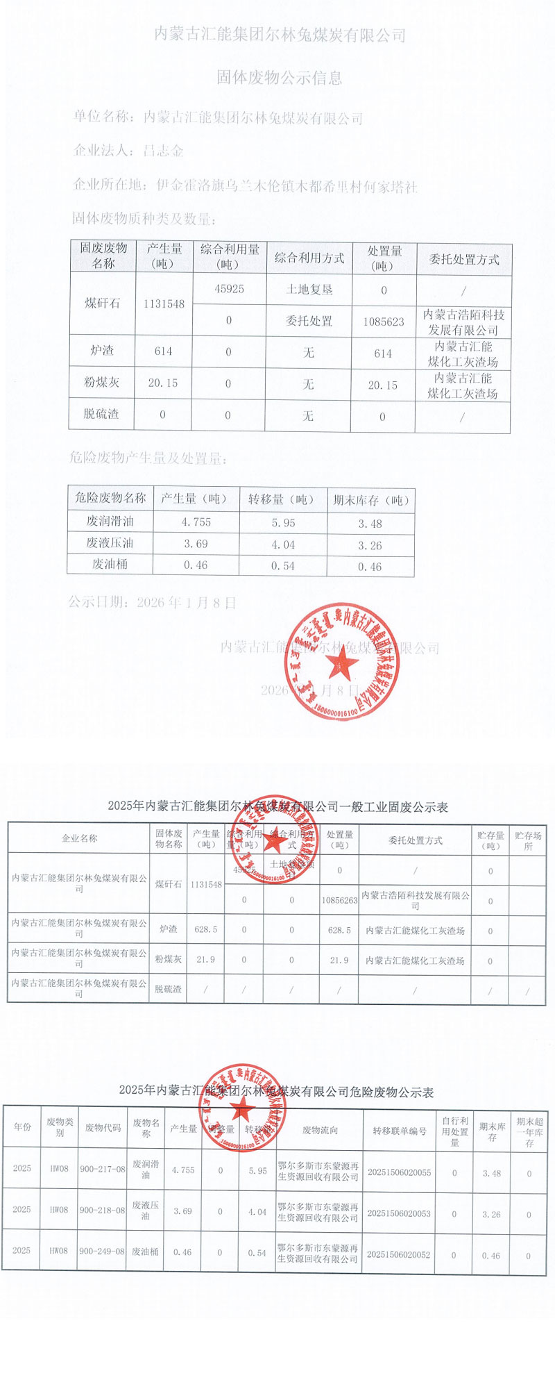 內蒙古匯能集團爾林兔煤炭有限公司 固體廢物公示信息
